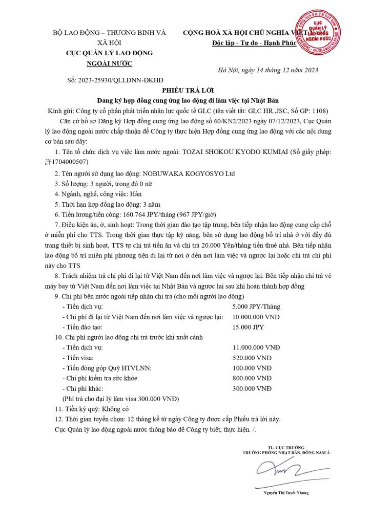Công ty cổ phần phát triển nhân lực quốc tế GLC  hoạt động đưa người lao động Việt Nam đi làm việc có thời hạn ở nước ngoài theo giấy phép của Bộ lao động Thương Binh và Xã Hội. Hiện công ty cần tuyển lao động đi làm việc tại Nhật Bản với các điều kiện, tiêu chuẩn sau:
