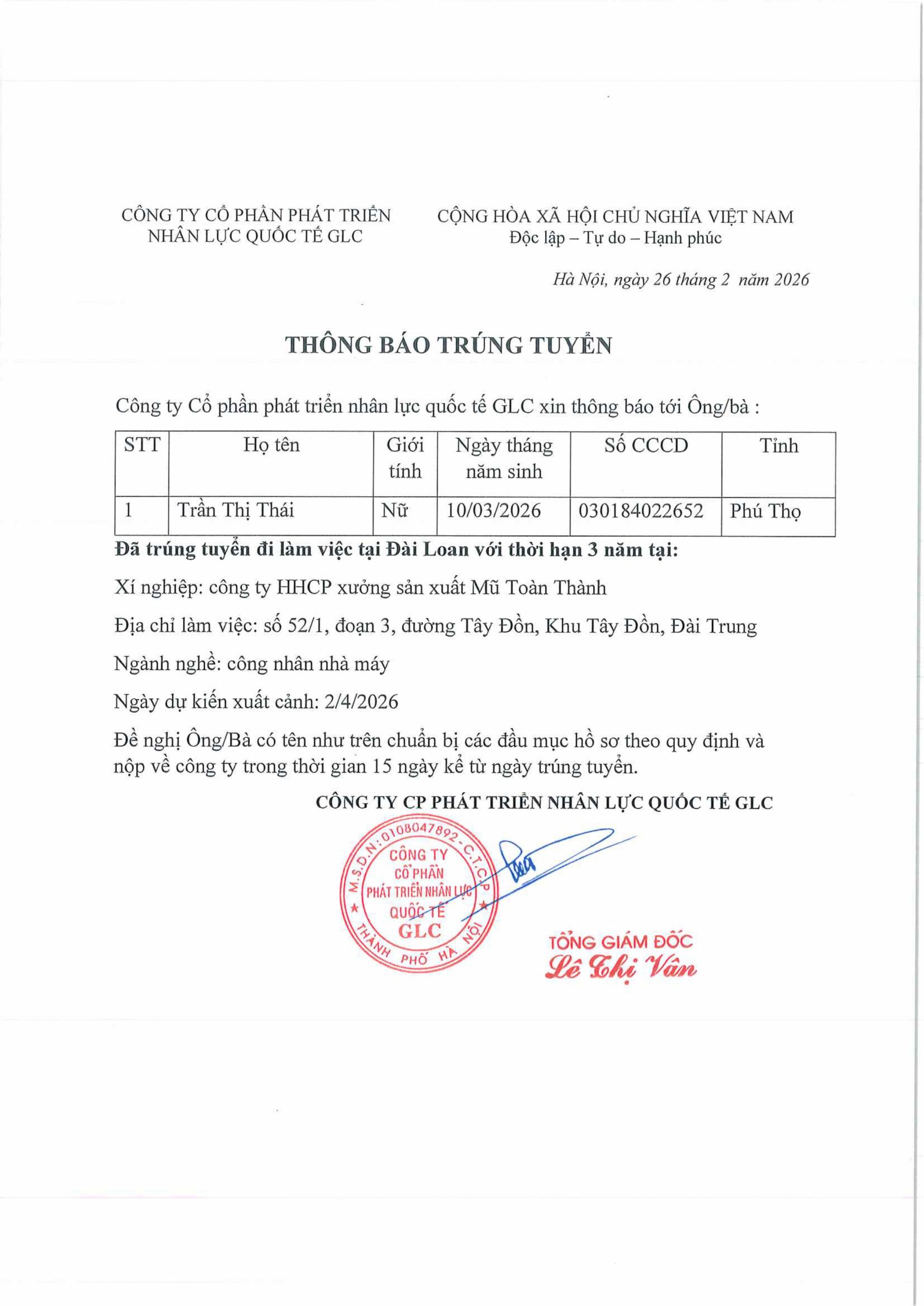 Thông báo trúng tuyển THÔNG BÁO TRÚNG TUYỂN ĐƠN CÔNG NHÂN NHÀ MÁY LÀM TẠI ĐÀI LOAN THÔNG BÁO TRÚNG TUYỂN ĐƠN HÀN LÀM TẠI NHẬT BẢN THÔNG BÁO TRÚNG TUYỂN ĐƠN IN ẤN LÀM VIỆC TẠI NHẬT BẢN