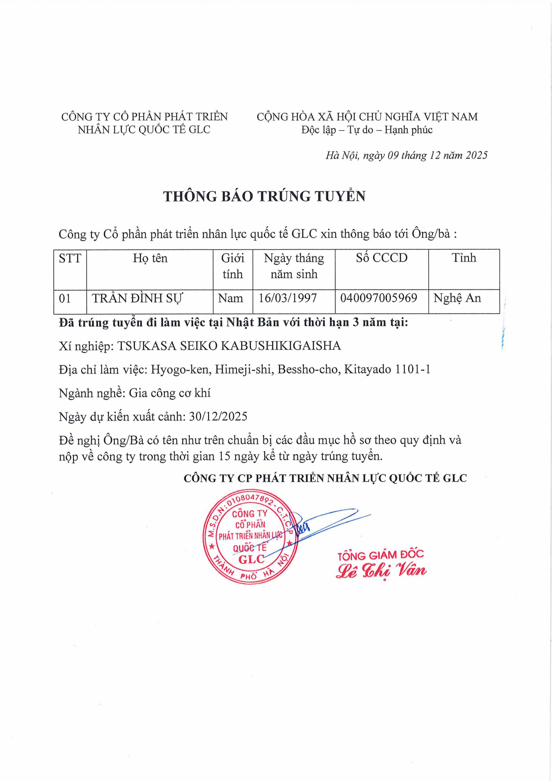 Thông báo trúng tuyển THÔNG BÁO TRÚNG TUYỂN ĐƠN GIA CÔNG CƠ KHÍ THÔNG BÁO TRÚNG TUYỂN ĐƠN NÔNG NGHIỆP CHĂN NUÔI LÀM VIỆC TẠI NHẬT BẢN THÔNG BÁO TRÚNG TUYỂN ĐƠN LAO ĐỘNG PHỔ THÔNG TẠI Ả RẬP XÊ ÚT