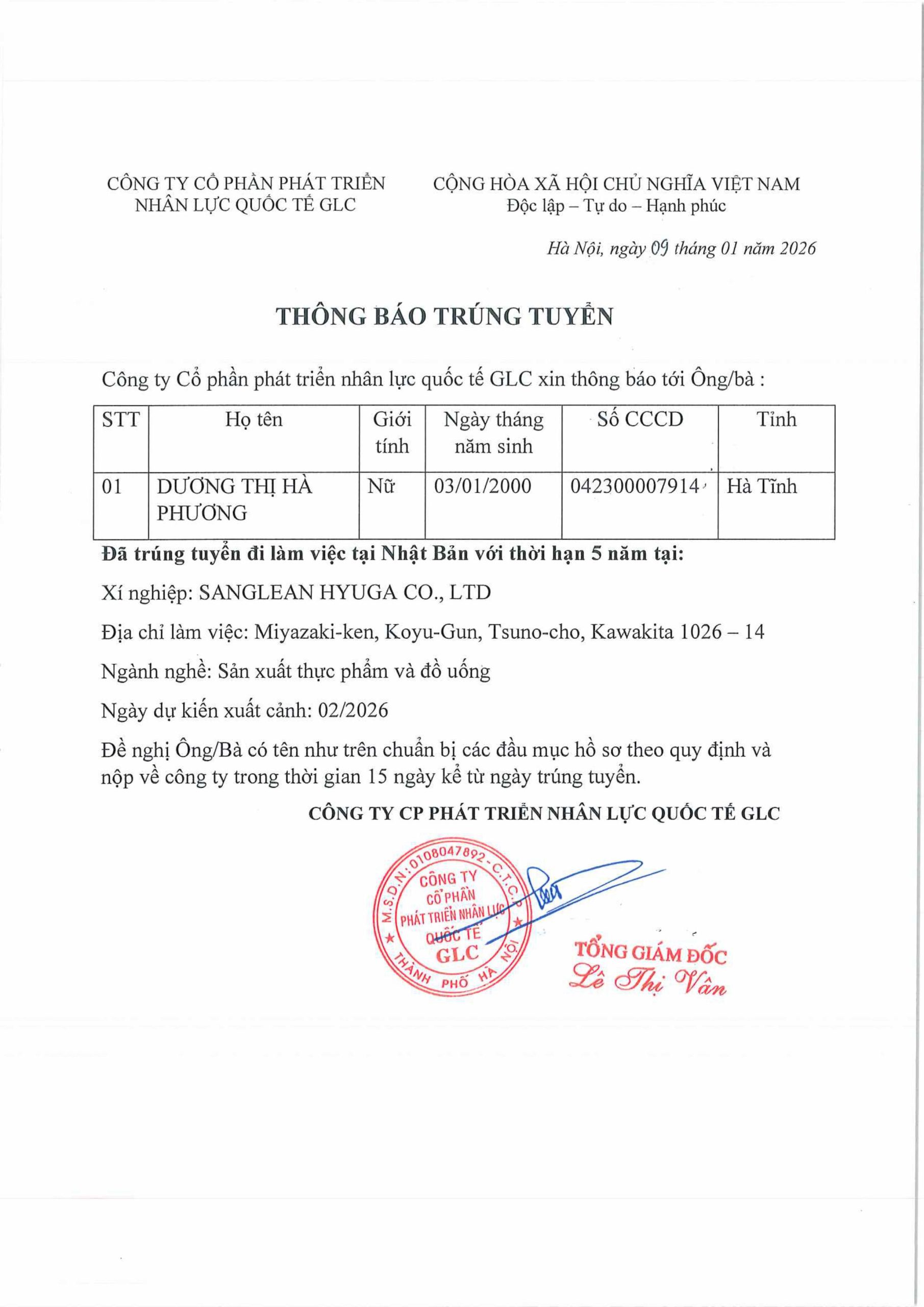 Thông báo trúng tuyển THÔNG BÁO TRÚNG TUYỂN ĐƠN SẢN XUẤT THỰC PHẨM VÀ ĐỒ UỐNG TẠI NHẬT BẢN THÔNG BÁO TRÚNG TUYỂN ĐƠN DỆT MAY ĐI LÀM TẠI NHẬT BẢN THÔNG BÁO TRÚNG TUYỂN ĐƠN HÀN LÀM TẠI NHẬT BẢN