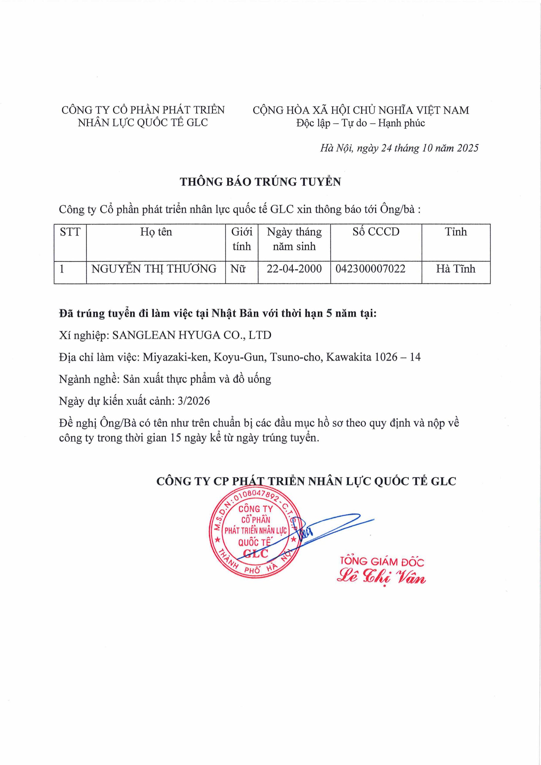 THÔNG BÁO TRÚNG TUYỂN ĐƠN HÀN LÀM VIỆC TẠI NHẬT BẢN