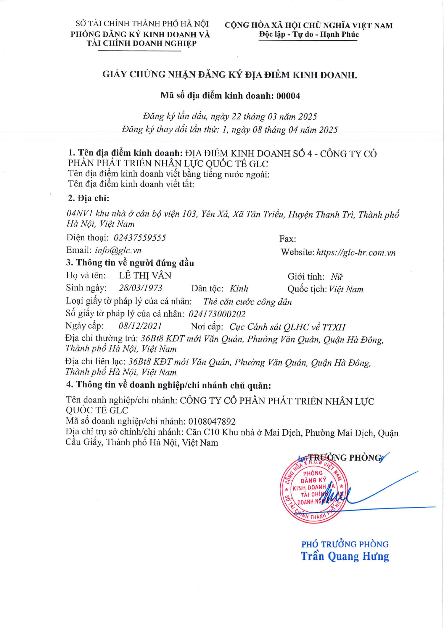 - Địa điểm kinh doanh: ĐỊA ĐIỂM KINH DOANH SỐ 4- CÔNG TY CỔ PHẦN PHÁT TRIỂN NHÂN LỰC QUỐC TẾ GLC