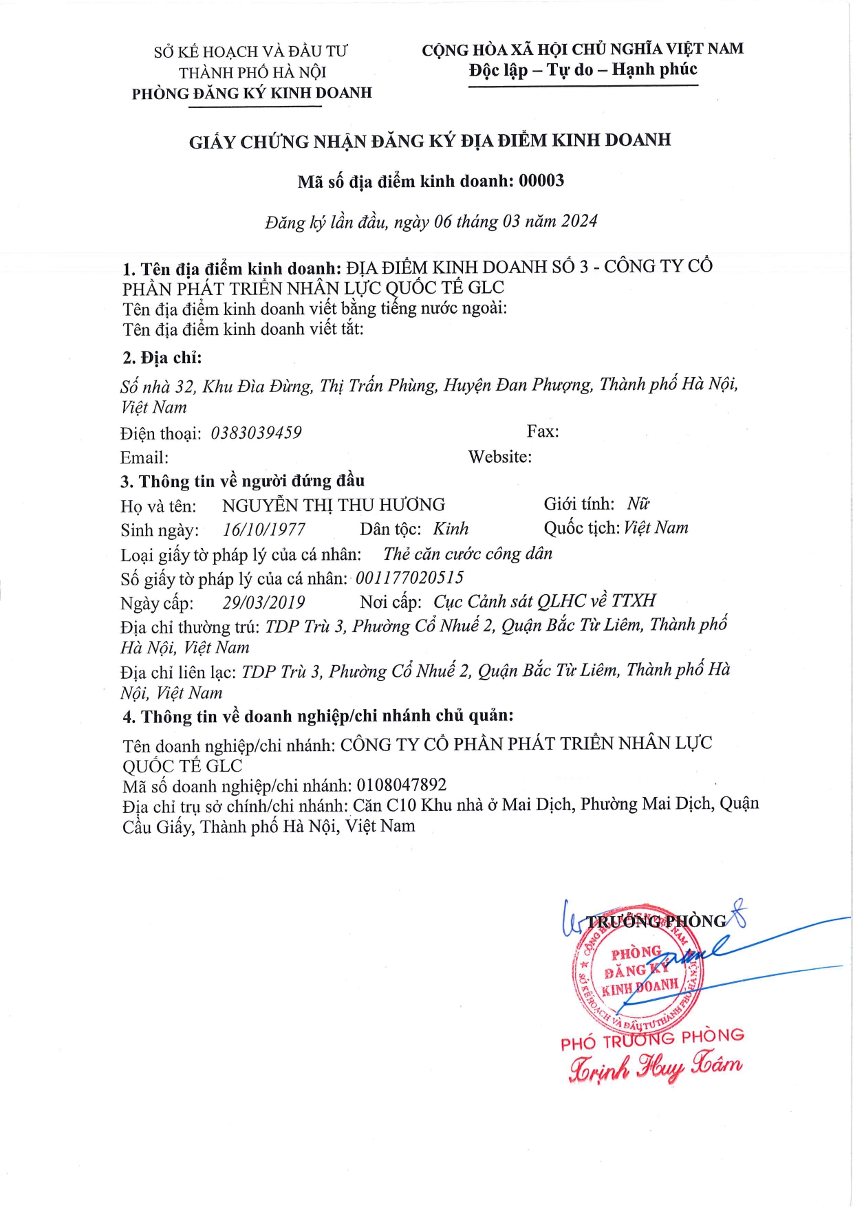 - Địa điểm kinh doanh: ĐỊA ĐIỂM KINH DOANH SỐ 3- CÔNG TY CỔ PHẦN PHÁT TRIỂN NHÂN LỰC QUỐC TẾ GLC