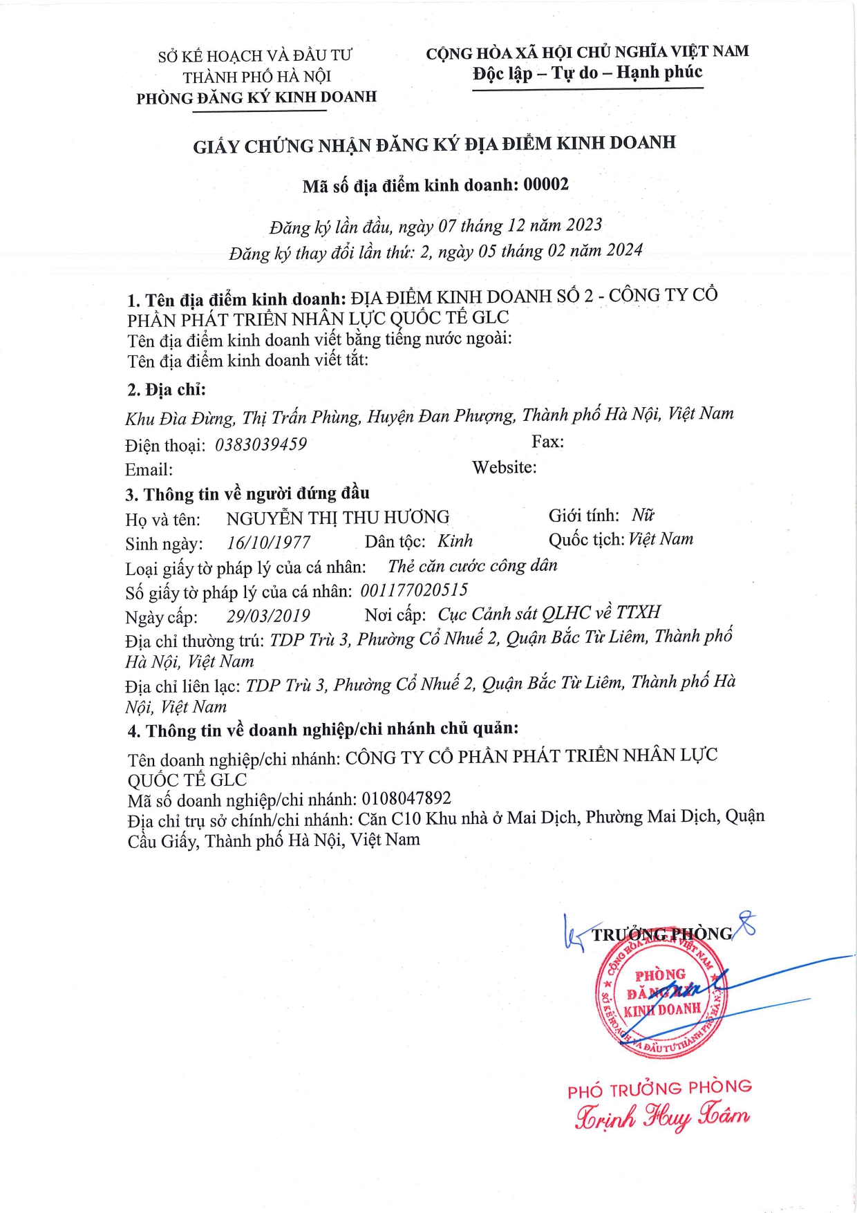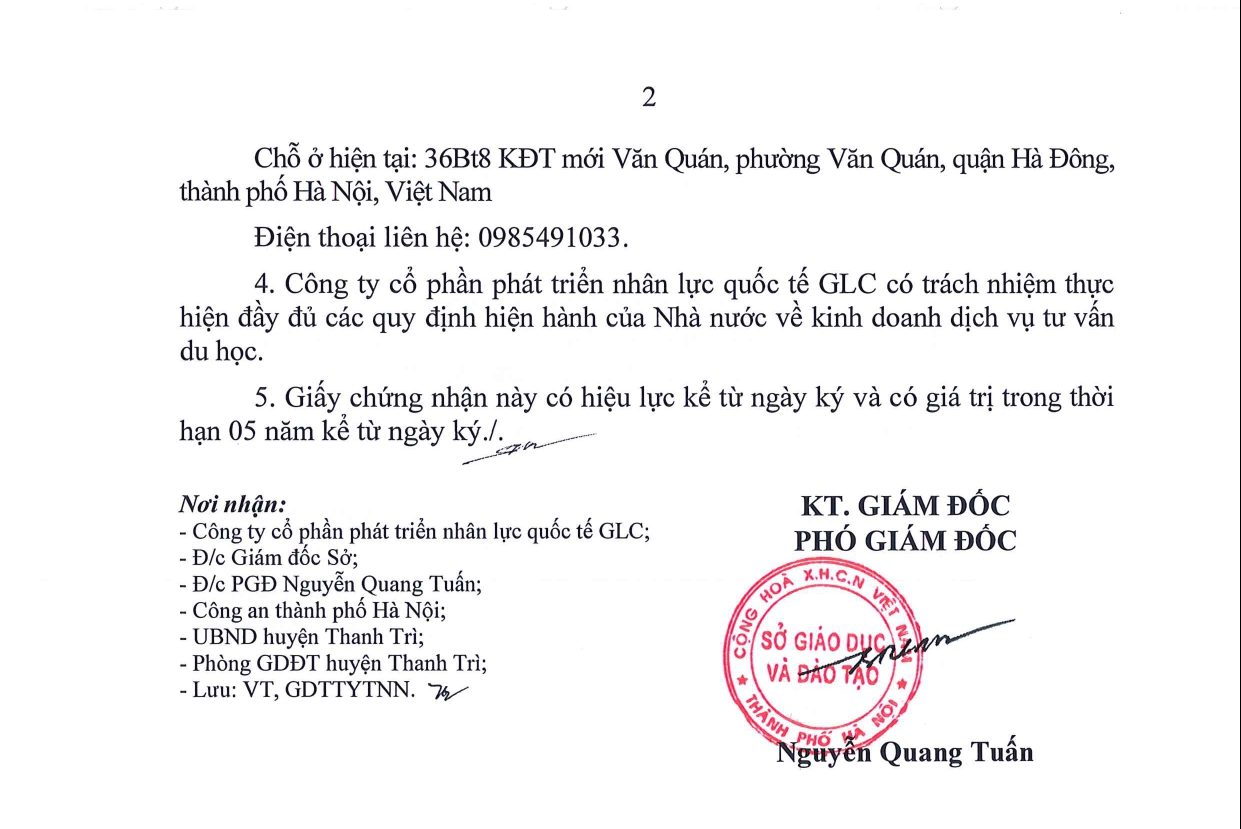 - Địa điểm kinh doanh: ĐỊA ĐIỂM KINH DOANH SỐ 2- CÔNG TY CỔ PHẦN PHÁT TRIỂN NHÂN LỰC QUỐC TẾ GLC