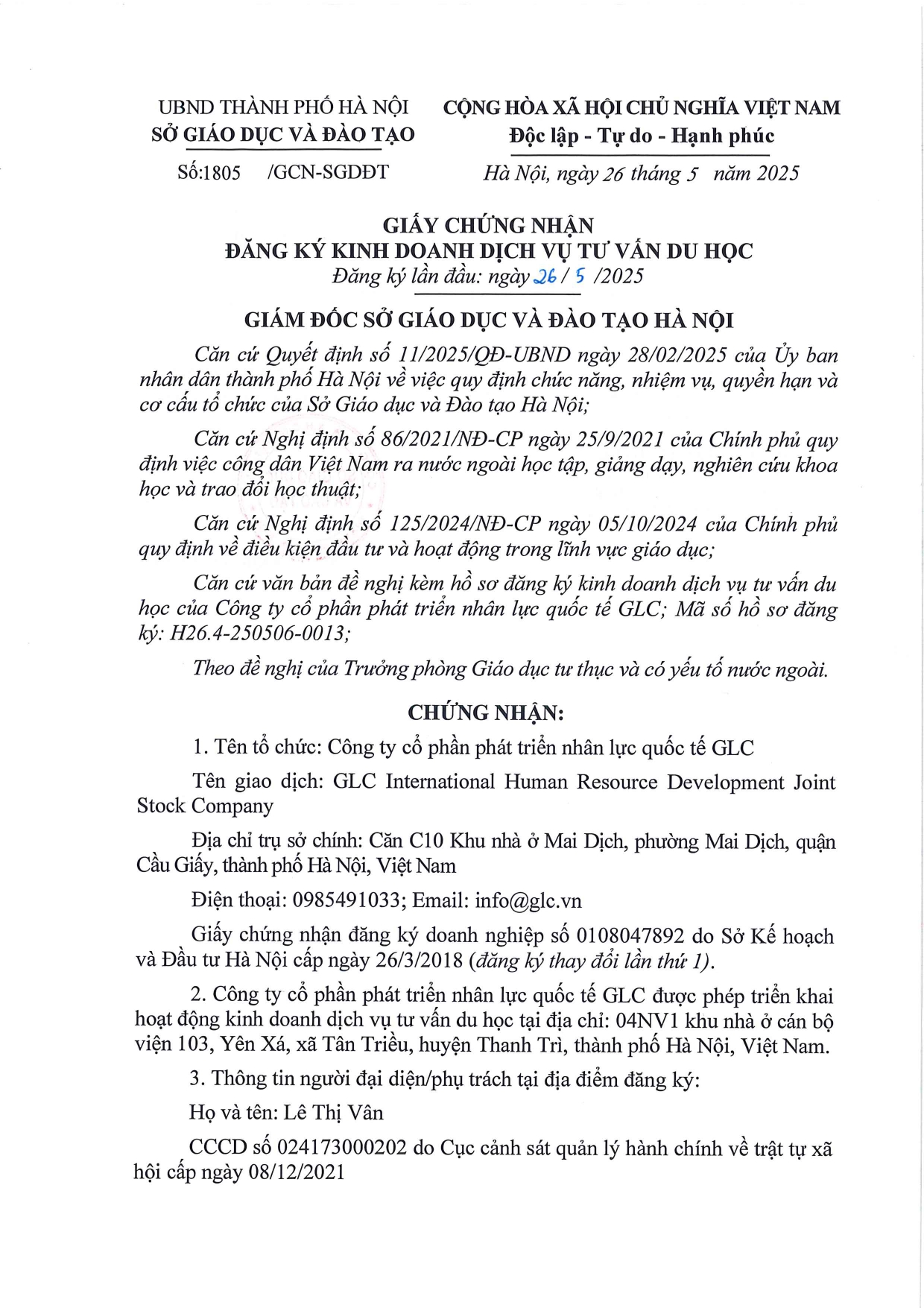 - Giấy chứng nhận đăng kí kinh doanh dịch vụ tư vấn du học số 1805/GCN-SGDĐT cấp ngày 26/05/2025