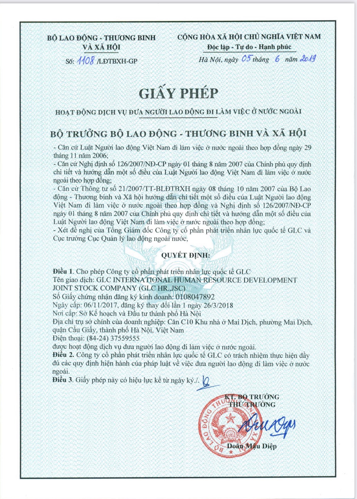 - Thông tin về Giấy phép hoạt động dịch vụ đưa người lao động Việt Nam đi làm việc ở nước ngoài đã được cấp: Số 1108/LĐTBXH-GP cấp ngày 09 tháng 03 năm 2021 cấp đổi lần thứ 1 ngày 26 tháng 03 năm 2018